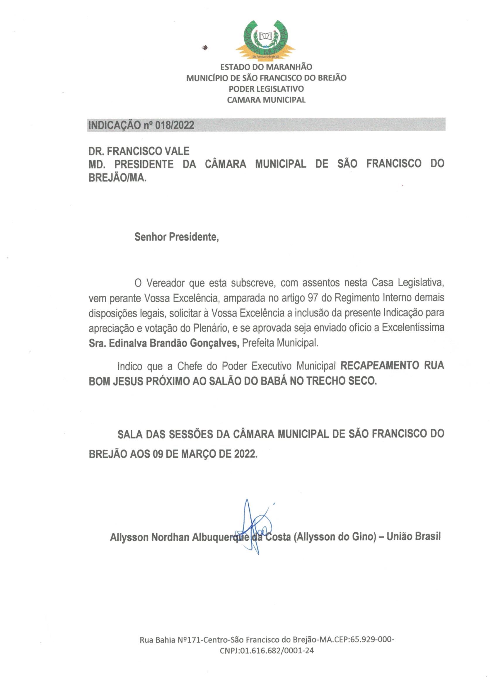 Indicação Nº 18/2022INDICAÇÃO Nº 018-2022 - RECAPEAMENTO DA RUA BOM JESUS - ALLYSSON Baixar Votação Nominal