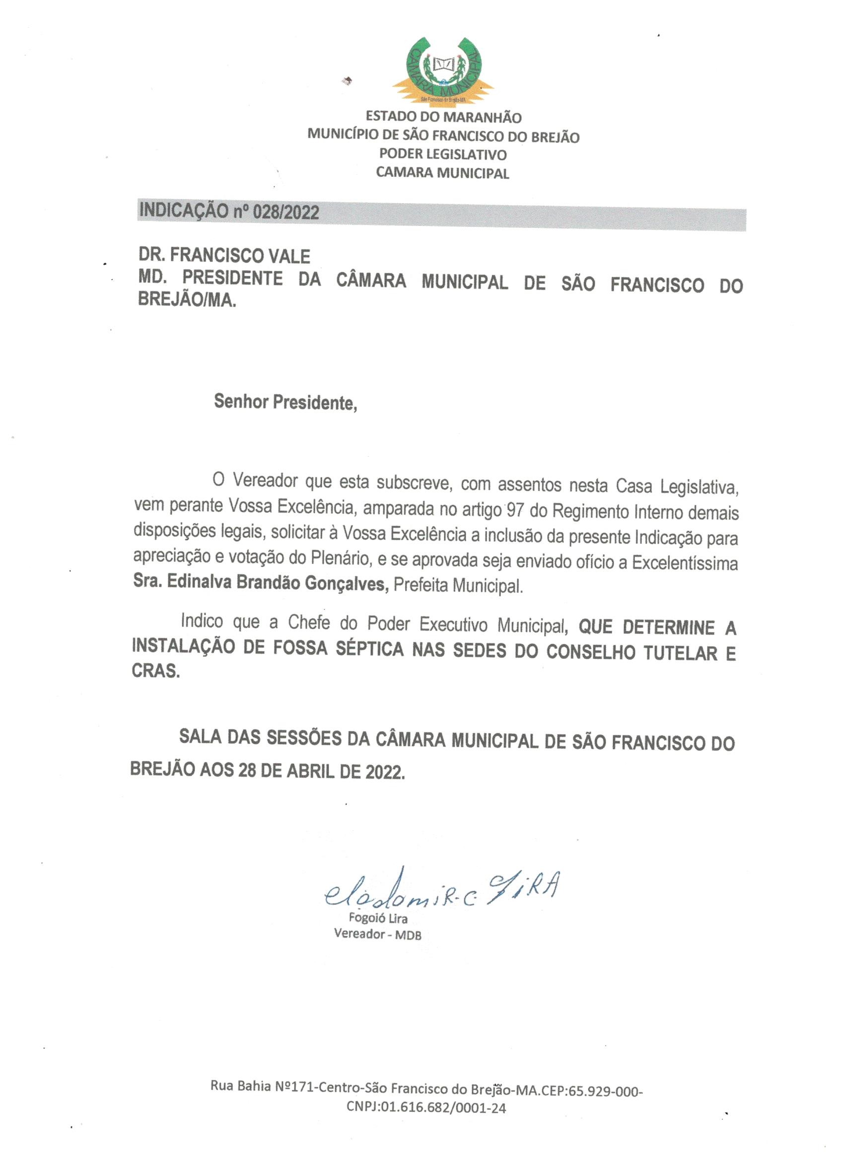 Indicação Nº 28/2022INDICAÇÃO 028-2022 - CONTRUÇÃO DE FOSSA NO CRAS - CLODOMIR Baixar Votação Nominal