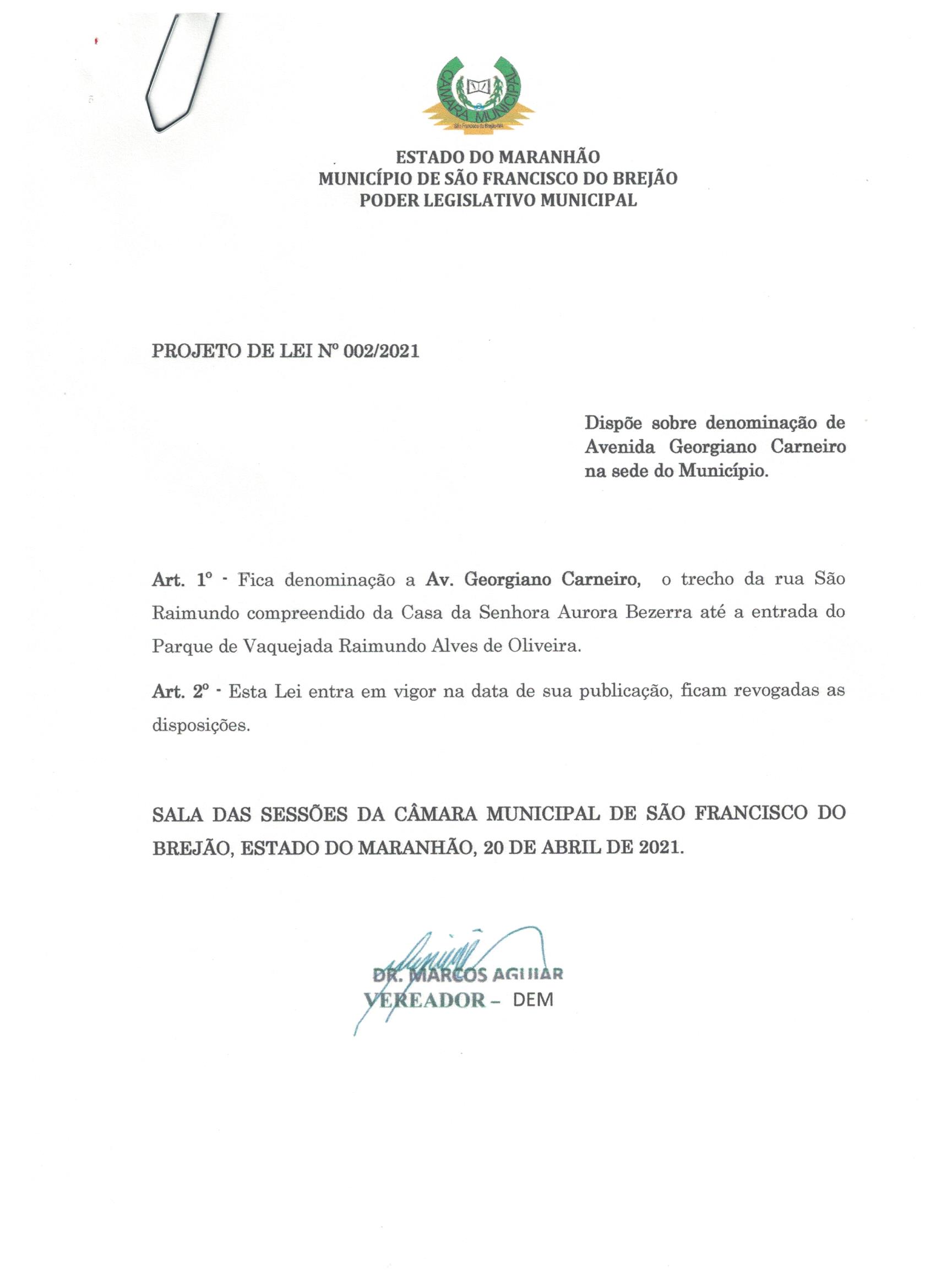 Projeto Nº 2/2021PROJETO DE LEI DO LEGISLATIVO Nº 02/021 - DENOMINA AV. GEORGIANO CARNEIRO - MARCOS AGUIAR Baixar Votação Nominal